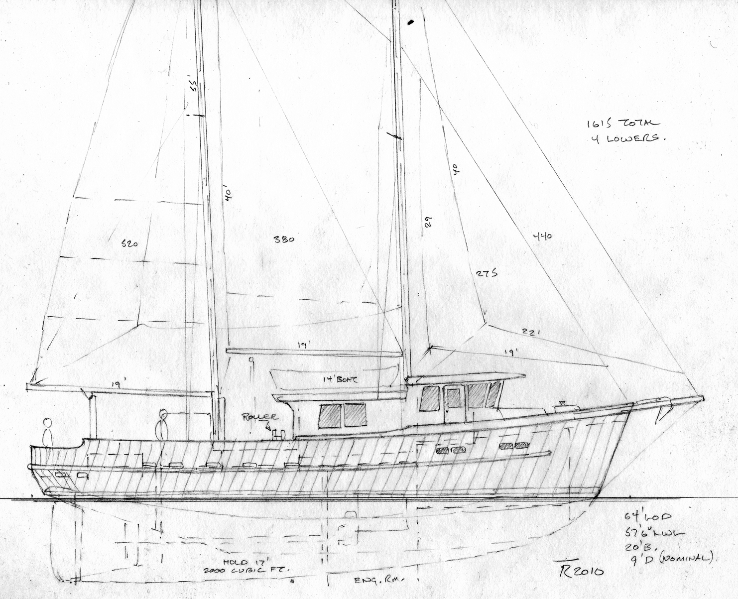 These concepts originated from a conversation on Boatdesign.net concerning the premise of a sail assisted tuna troller/longliner. The prospective owner/builder was thinking about the optimum size and carrying capacity of a boat able to make some headway under sail and fish well offshore for a month or six weeks at a time. All catch would be fresh frozen at sea.